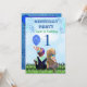 Um menino bonito e seu cachorro sentados ao lado dele segurando um balão de aniversário. Primeiros Convites de festas de aniversários.