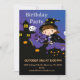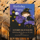 Um feiticeiro bonitinho cavalgando sua vassoura numa noite escura. Convite para festa de Halloween de aniversário do garoto