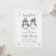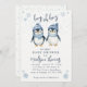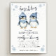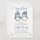 moço oh chá de fraldas inverno gêmeos apresentando dois pinguins bonitos em chapéus e cachecóis azuis de inverno, flocos de neve e neve
