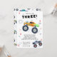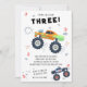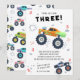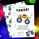 Jovem Wild e Três Crianças-aniversário de 3 anos Monster Car Trucks O Convite apresenta caminhões de carros monstros bonitos e coloridos com o texto "Jovem, selvagem e três" no moderno roteiro de tipografia negra acentuado com o número 3 e rabiscos. Perfeito para as crianças na terceira festa de aniversário. Envie o e-mail ou simplesmente baixe o convite digital compartilhável para download. Projetado pelo Evco Studio. Para obter informações sobre a coordenação de itens, consulte www.zazzle.com/store/evcostudio