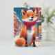 Ilustração da alegre raposa antropomórfica sentada na vibrante rua da cidade, agora transformada para o feriado. A raposa, enfeitada com um lenço vermelho e um chapéu de Papai Noel, fede de alegria. O fundo urbano é pulverizado com neve branca e macia, criando uma atmosfera festiva e confortável. Os flocos de neve caem suavemente ao redor da cena, e as árvores que guardam a calçada são decoradas com luzes brilhantes e ornamentos coloridos. O carro vintage azul claro está agora decolado com uma coroa na frente, melhorando o charme caprichoso.