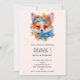 Um convite de aniversário com uma ilustração de um retrato adorável de raposa com uma coroa e coleira florais azul e laranja.