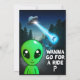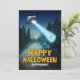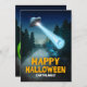 OVNI e rapto de alienígenas com dizeres "Feliz Halloween Terthlings". Na parte de trás, alienígena verde e citação querem dar uma volta?