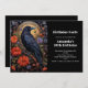 Um convite de aniversário com um corvo preto empoleirado num galho rodeado de flores vermelhas. Legal vibração gótica.