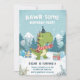 Celebre o grande dia do seu pequeno com este adorável convite de aniversário de dinossauro de inverno RAWR-some! Com um adorável T-Rex verde em um chapéu de festa e cachecol, cercado por montanhas nevadas, pinheiros, balões e presentes, este convite é perfeito para uma festa de aniversário de inverno aconchegante. Fácil de personalizar com o nome da criança, idade, detalhes da festa e informações de RSVP.