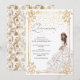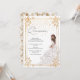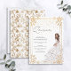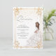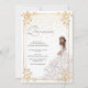 Um belo confete floral branco e dourado ilustra a menina real ou a princesa Quinceañera convite de aniversário. "Quinceañera" está escrito em uma bela e delicada escrita à mão, num fundo de cor-de-rosa pincelado. Uma linda garota de um lindo vestido branco e rosa escamoteado com brilhos dourados, joias e tiara aparece embaixo à direita, e o confete dourado cai do topo, e toda a cena é bordada por um quadro floral brilhante. A parte de trás do convite apresenta uma broca branca e dourada. Que lindo! Copyright Elegant Invites, todos os direitos reservados.