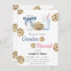 Menino ou Menina. Azul ou Rosa. Biscoitos de chocolate com aquarela e leite com gênero revelam festa. A parte reveladora de gênero é decorada com um copo d'água de leite e garrafa de leite com arco azul. Padrão de cookies.