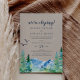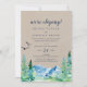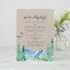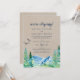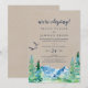 Este cartão de recepção de casamento às escondidas Kraft Rocky Mountain é perfeito para uma festa ao ar livre após o casamento. O design apresenta uma paisagem selvagem pintada em azul e verde com árvores de pinheiro em aquarela, pássaros e montanhas em um fundo de papel kraft claro falso. Cartões de RSVP são vendidos separadamente.