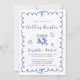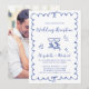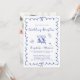 Convite de recepção de casamento romântico com uma moldura ondulada azul francês adornada com laços coquetes, ilustrações caprichosas desenhadas à mão de um coração, estrelas e taças de vinho, e "Recepção de Casamento" e os nomes da noiva e do noivo exibidos em um script azul divertido. Adicione sua foto no verso.