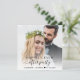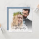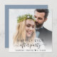 Elegante elopemento azul empoeirado ou pequeno anúncio de casamento e convite de recepção com a sua foto do dia de casamento e "Felizmente Nunca Depois da Festa" em uma mistura de simples tipografia branca e um roteiro branco-chic com pestanas, adicione seus primeiros nomes a um coração e sua data de casamento ou recepção. Ao contrário, você pode personalizar sua mensagem e adicionar detalhes de festa ou recepção e seus nomes em um script semelhante a assinatura.