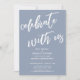 A distinção deste conjunto se deve à fonte moderna de caligrafia manuscrita usada para as frases de destaque. Nesta peça, a fonte manuscrita foi usada para criar um gráfico que representa as palavras "celebre conosco". Use os campos do modelo para adicionar seus detalhes pessoais e tornar este design moderno e único. O fundo azul empoeirado pode ser alterado para qualquer cor que você preferir. Entre em contato para qualquer solicitação especial ou para obter ajuda na personalização. // 100 //