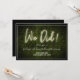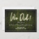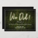 Um convite de recepção de casamento com texto de neon branco "Nós Fizemos!" sobre um fundo de buxo com texto e acabamento branco.