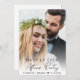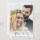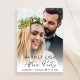 Casamento moderno e fuga romântica e convite de anúncio e recepção de casamento para pequenos grupos para informar familiares e amigos que você se casou em uma cerimônia de casamento íntima, e para convidá-los agora para uma recepção de casamento. A frente apresenta sua foto do dia do casamento sobreposta com "Festa Feliz para Sempre" em uma mistura de tipografia simples e uma escrita elegante. Abaixo da sua foto, adicione seus primeiros nomes e data do casamento. No verso, personalize sua mensagem com mais detalhes e adicione detalhes da festa ou recepção e seus nomes em uma escrita com estilo de assinatura.
