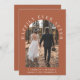 Convite moderno de casamento e elopement de terracota e convite de recepção de casamento privado. A frente apresenta sua foto de casamento em uma moldura arqueada e "Felizes para Sempre" em tipografia branca elegante. Adicione seus primeiros nomes, data e local do casamento. No verso, personalize seu anúncio de casamento e convite de recepção e adicione seus nomes em uma caligrafia semelhante a uma assinatura.