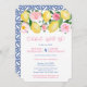 (Casamento) convite apenas para a recepção com limões aquarela e flores cor-de-rosa, complementado por azulejos azuis e brancos no verso. Isso foi projetado para convidar os convidados para uma grande celebração de casamento, tendo tido apenas uma pequena cerimônia de casamento com poucas pessoas presentes.