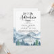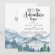 Cena de montanhas e floresta em aquarela rústica elegante para recepção de casamento feliz para sempre, apresentando árvores e montanhas azuis e verdes exuberantes com um texto em letra cursiva: que a aventura comece. Para quem ama um clima romântico e sonhador de floresta para sua cerimônia e celebração. Este convite é para aqueles que tiveram um casamento pequeno e privado e estão organizando uma celebração pós-casamento. Veja a coleção completa de produtos para este design: https://www.zazzle.com/collections/119965625201006103