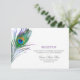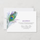 Cartão de recepção de casamento elegante com pena de pavão em aquarela.
