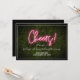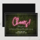 Um convite de recepção de casamento com o texto neon "Cheers!" sobre um fundo de buxinho com texto e acabamento branco.