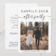 Elemento elegante ou anúncio de casamento menor e convite para recepções de casamento. A frente apresenta sua foto, "Felizmente, nunca depois da festa" em uma mistura de simples tipografia e um roteiro de chic com supressões, e seus primeiros nomes e data de casamento juntos por um coração. No verso, personalize seus detalhes, insira seu endereço no site do casamento para criar um código QR para os convidados digitalizarem suas fotos de casamento, todos os detalhes e para RSVP on-line, e adicione seus nomes em um script semelhante a assinatura.