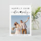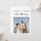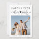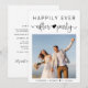 Convite de recepção e anúncio de casamento ou fuga romântica moderna. A frente apresenta a foto do seu dia de casamento e "Festa Feliz para Sempre" em uma mistura de tipografia simples e um script elegante com um coração e floreios. Sob sua foto, adicione seus primeiros nomes e data de casamento. No verso, adicione detalhes da festa ou recepção e seus nomes em um script semelhante a uma assinatura.