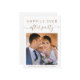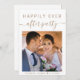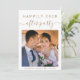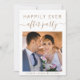 Elegante ou anúncio privado de casamento e convite de recepção. A frente mostra sua foto do dia do casamento, "Feliz Festa de Sempre" em uma mistura de simples tipografia de ouro e um guião de ouro com baloiços, seus nomes e data do casamento. No lado oposto, personalize seus detalhes de anúncio e convite e adicione seus nomes em um script dourado como assinatura.