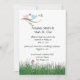 Convites de recepção de pássaros apaixonados rosa e azul fofos. Pássaros apaixonados rosa e azul em um galho com gramíneas e flores na parte inferior. As informações de RSVP estão incluídas no verso, mas se você preferir um RSVP separado, por favor envie um e-mail para shutterbug600@yahoo.com