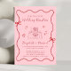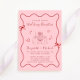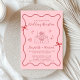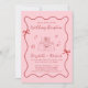 Trendy, convite de recepção de casamento rosa e vermelho inspirado na Tendy, com um quadro ondulado adornado com arcos coqueteiros e ilustrações desenhadas à mão caprichosa, estrelas e uma elegante mesa romântica de casamento. "Recepção de casamento" e os nomes da noiva e do noivo são mostrados em um roteiro vermelho lúdico.