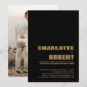 Convide seus amigos e entes queridos com este na moda negro minimalista com convite de recepção de casamento de texto dourado com uma foto dos recém-casados nas costas para compartilhar sua alegria em seu casamento recente. Para obter melhores resultados, ajuste a imagem escolhida para o verso do recorte de convite para uma proporção de 5 x 7.