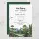 Convide seus entes queridos para celebrar seu casamento com este convite de recepção rústico de Rocky Mountain. Com uma paisagem selvagem lindamente pintada com árvores de pinheiro em aquarela, pássaros voando alto e montanhas majestosas, o design é colocado contra um fundo de papel kraft claro falso para uma sensação natural e ao ar livre. Cartões de RSVP estão disponíveis separadamente.