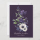 Este belo e elegante convite para recepções de casamento florais apresenta flores roxas escuras, azuis marinhos e natas brancas de aquarela em fundos creme e roxos escuros e roteiro de caligrafia, e é fácil de personalizar com suas próprias informações de casamento. Perfeito para o casamento de inverno, primavera ou verão. Design de T.K. em frente.