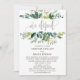 Este cartão de recepção de casamento fuga 'nós fugimos' com folhagem é perfeito para uma festa pós-casamento fuga rústica. O design apresenta uma moldura boho de folhas verdes e botânicos de folhagem verde. Os cartões de RSVP correspondentes são vendidos separadamente.