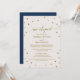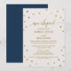 Este convite de recepção de casamento furtivo com bolinhas de ouro é perfeito para uma festa de casamento elegante. O design simples apresenta confetes dourados chiques em um fundo de champanhe cremoso com bela caligrafia em folha de ouro falsa e um verso azul marinho. Cartões de RSVP são vendidos separadamente.