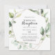 Este convite de recepção de casamento geométrico elegante com dourado e folhagem é perfeito para uma festa simples após a fuga romântica. O design apresenta folhas de eucalipto verde botânico pintadas à mão, adornando uma moldura geométrica dourada.