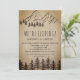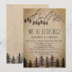 Celebre seu amor com um convite de recepção encantador inspirado na floresta. Apresentando a silhueta de uma majestosa floresta de pinheiros e montanhas em um fundo de papel kraft falso, este design é perfeito para uma reunião rústica após a fuga. Ideal para casais que amam a natureza, define o tom para uma celebração aconchegante e cênica. Cartões de RSVP são vendidos separadamente. Por favor, note: Este design é um gráfico impresso de alta qualidade e não é papel kraft real.