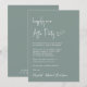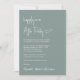Convite à recepção de casamento verde de sábio minimalista, com "Feliz Nunca Depois da Festa" em um roteiro branco moderno, seu anúncio e convite para casamentos, e seus nomes em um roteiro branco tipo assinatura.