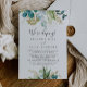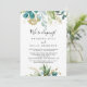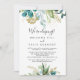 Este cartão de recepção de elopemento verde tropical em ouro é perfeito para uma festa de elopemento poste de destino. O design apresenta predominantemente folhagem verde-aquosa pintada manualmente, acoplada a flores douradas, enfeitando uma elegante moldura geométrica. As placas RSVP são vendidas separadamente.