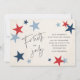 Um Convite de festas vermelho-Americana rústico, branco e azul, 4 de julho, com estrelas e fundo de papel-pergaminho.