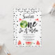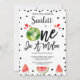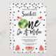 Red Black Modern One in A Melon primeiro aniversario Invitation Watermelon temeu o primeiro convite de aniversário para uma menina com melancia inteira e fatias de melancia. Este no primeiro convite de aniversário do melão também apresenta algumas canetas pretas e um título de caligrafia decorativa.