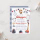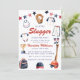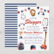 Celebrate the upcoming arrival of your little slugger with this adorable baseball-themed baby shower invitation. The design features charming watercolor illustrations of baby baseball attire, a baseball glove, bat, trophy, and a festive star banner in red, white, and blue. It's the perfect way to invite guests to honor the mom-to-be with a sporty and fun theme. This invitation sets a playful tone for a memorable baby shower celebration, ensuring your guests are excited to join the festivities.