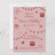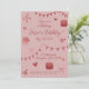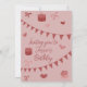 A red invitation with hearts, cakes, and bows