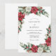 This design evokes a classic holiday atmosphere with rich winter foliage. It features striking red poinsettias, creamy white roses, and rustic pinecones. Lush evergreen needles, holly berries, and sage green leaves create a festive botanical arrangement against the crisp background. This artwork is perfect for a seasonal nuptial event.