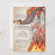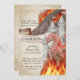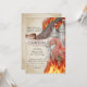 Este convite de festas personalizado apresenta um tema de fantasia de estilo aquarela. Uma imagem de um dragão vermelho é fotografada em frente a um castelo de conto de fadas com chamas queimando ao seu redor. As montanhas também estão em chamas a distância. O fundo é um design de papel pergaminho desbotado, com moldura de ouro ornamentado para se assemelhar a uma página de um livro antigo.