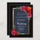 Convite para casamento floral vermelho e rosa elegante com uma borda preta e dourada e um painel interior de cinzas para destacar os detalhes do convite.