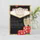 Este glamouroso convite de festas noturno apresenta um tema brilhante em Las Vegas sobre um fundo negro. Um par de dados vermelhos brilham na parte inferior direita, com dois vidros espumantes de champanhe colocados em frente aos dados. Um sinal de boas-vindas ao estilo Las Vegas é colocado no topo com "Game Night" impresso sobre ele em uma fonte de brilho dourado. Uma sequência dourada enquadra o convite.