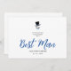 Minimalist Exquisite Gorgeous Script Best Man Wedding Proposal Card in Black and Blue. Presenting the Best Man Proposal Card, a unique expression of style in black and Blue, available in digital or physical format. It captures the essence of sophistication with a carefully crafted illustration of a gentleman in a top hat and bowtie against a white background, adding a distinctive touch of elegance to the proposal. The selected typography, with its script conveying grace and sophistication, seamlessly blends with the black and faux gold palette, providing a luxurious and distinctive touch. We offer versatility to cater to your preferences, including a standard envelope for the printed version. This card goes beyond being a mere proposal; it is a tangible representation of the importance of friendship and the celebration that lies ahead. We hope this card serves as a lasting reminder of the special occasion. The Groomsman Proposal Card redefines elegance in the request to accompany the groom on his unique day. Every detail has been carefully chosen to create a sophisticated and memorable experience. For inquiries, customization, or more details, feel free to contact me through the platform's messaging system. NOTE: This design has been created with the assistance of artificial intelligence.