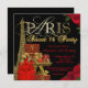 Convite de aniversário Paris Sweet 16 com linda Torre Eiffel de ouro, pacotes elegantes de presentes em Paris, calçados de salto alto com brilho dourado e roteiro Paris de ouro rico num fundo preto e rosa vermelha rico. Este belo convite de 16 anos de Paris é facilmente personalizado para o seu evento simplesmente adicionando os seus detalhes no estilo de letra e cor, e a redação da sua escolha. Este é um design impresso sem diamantes reais, joias, brilho, etc.