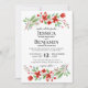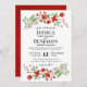 Este belo convite de casamento apresenta uma adorável design com manchas de flores de cor vermelha com folhas verdes e azuis. Este simples e elegante design de música de boho é perfeito para um inverno ou uma cerimônia de Natal devido ao esquema de cor vermelha e verde.