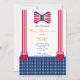 O Convite ao chá de fraldas celebra em estilo com estas tendências "Red White and Blue Arco Tie and Suspenders 4 de julho" baby 1rua ou qualquer aniversário de idade. Para itens correspondentes, ou um produto coordenado feito apenas para você, por favor, entre em contato comigo via Zazzle Chat e eu ficaria feliz em criar!