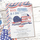 Red White e eu fazemos convite de festa de noivado. Design de estilo Vintage com estrelas e listre coração de amor romântico, fogos de artifício, beliche e bandeira americana. O texto do convite é editável se você quiser adicionar detalhes ao seu tema, como churrasco de quintal e cerveja. Perfeito para um quarto do tema de julho ou churrasco patriótico de verão.