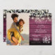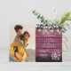 Um convite de na moda de casamento com sua foto especial, seu sábio bonito e folhas lilás, lanternas, jarras de pedras e seus detalhes de casamento, em um texto elegante sobre um fundo vermelho de madeira rusticada. Projetado por Thisnotme©